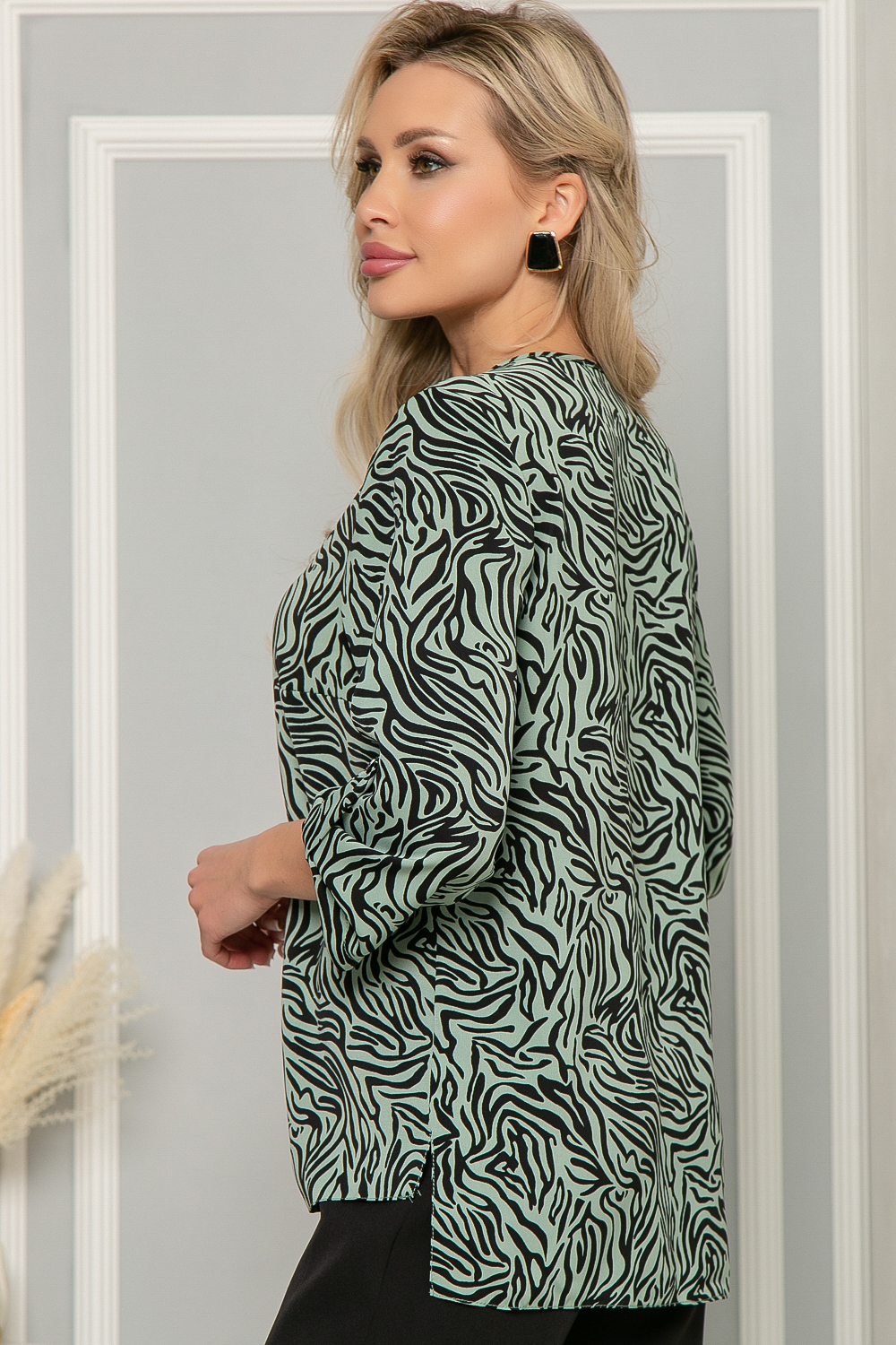Блуза прямого кроя, вырез горловины округлый. Низ изделия ровный, небольшие разрезы по бокам, спинка удлинена.