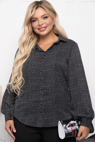 Классическая блуза в мелкий горошек - прекрасный вариант для офисных образов. Модель дополнена красивым акцентом - пышными рукавами на манжетах. По переду блузы выполнена имитация застежки на пуговицы.
