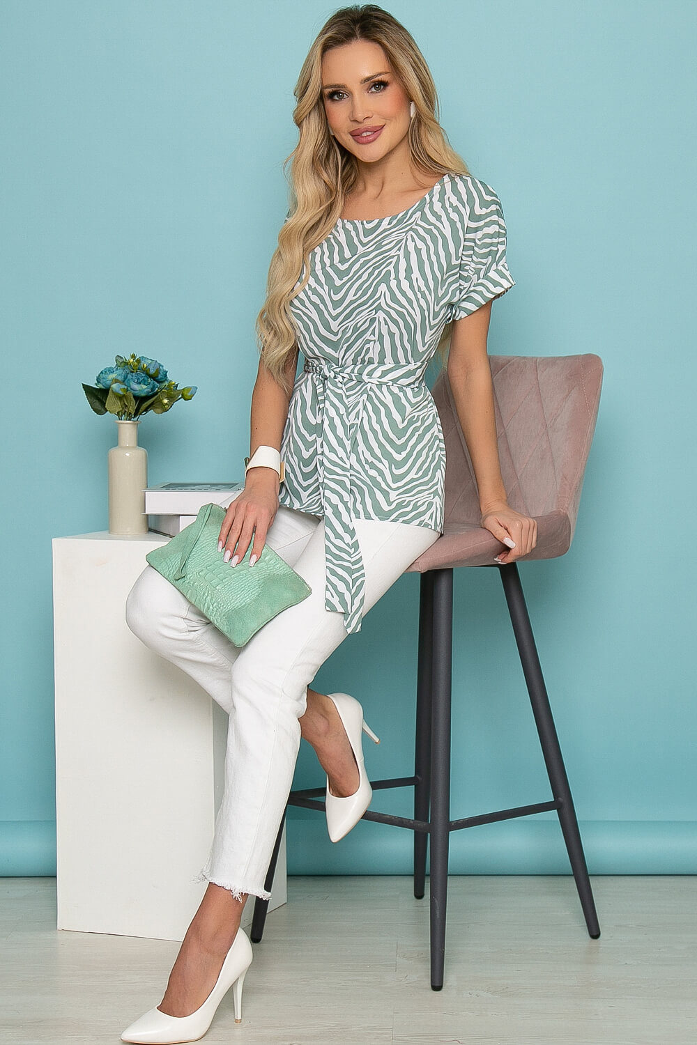 Блуза с анималистичным принтом в интересном цветовом решении. Её струящийся крой позволяет создать женственный образ. Блуза будет гармонично смотреться в сочетании как с деловым гардеробом, так и в повседневном образе, создавая романтичное настроение.