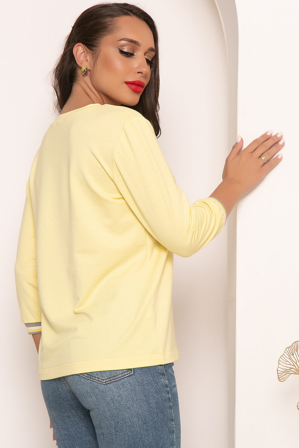 Стильный джемпер из мягкого трикотажа в нежном лимонном оттенке - отличный вариант для нескучного повседневного образа. Прекрасно будет сочетаться с джинсами, брюками или юбками в стиле спорт-шик.