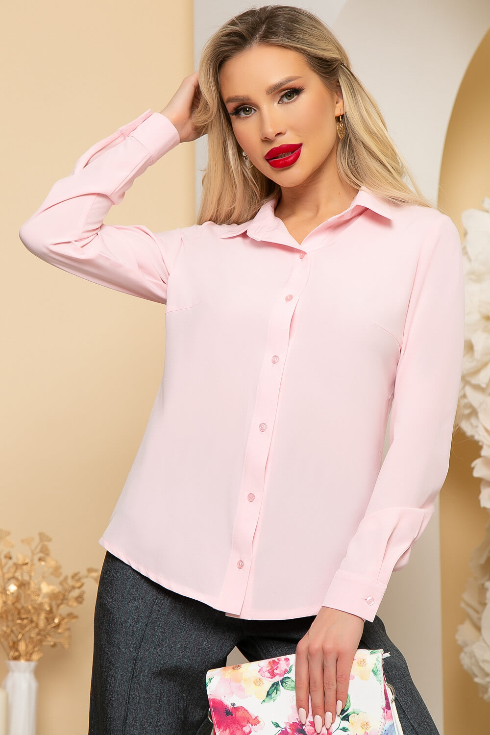 Блуза полуприлегающего силуэта, выполненная из приятной к телу ткани, в красивом розовом оттенке, который хорошо будет сочетаться с Вашим деловым гардеробом. Рукав втачной, длинный, низ рукава на манжете. Спинка скруглена.