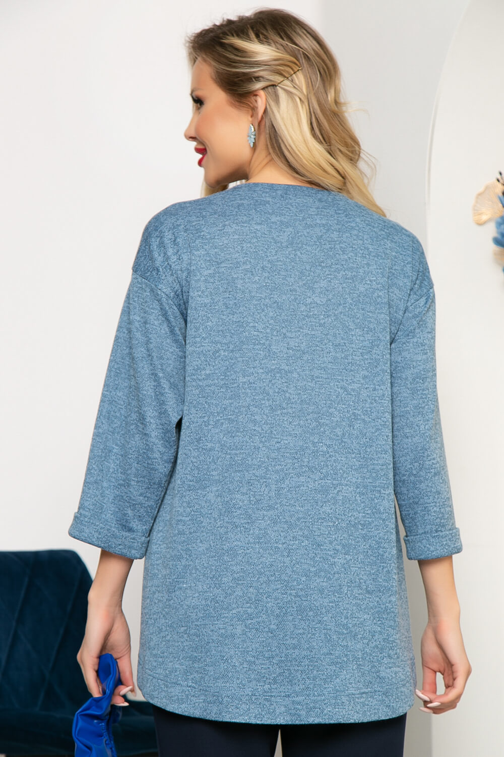 Комфортная туника из мягкого трикотажа в голубом оттенке прекрасно подойдёт для создания повседневных образов. Втачной рукав три четверти со спущенной плечевой линией на манжете. Туника хорошо сочетается, как с классическими брюками, так и с любимыми джинсами.