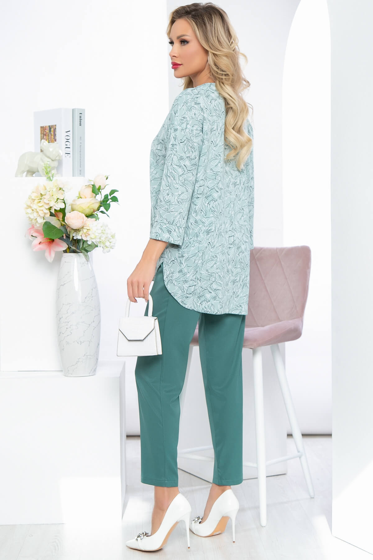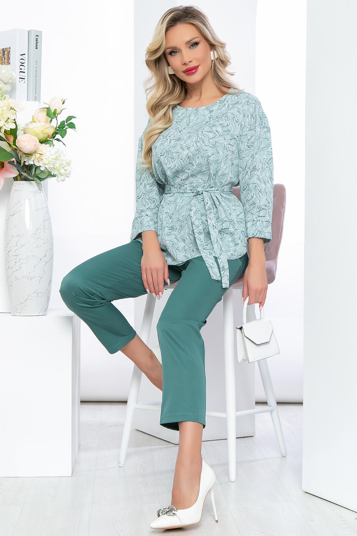Элегантный костюм, состоящий из брюк с высокой посадкой на резинке и блузы свободного кроя с удлинённой спинкой. Очень женственный комплект в стильной флористической расцветке. Блуза свободного кроя, округлый вырез горловины, рукав три четверти, со спущенным плечевым швом. По боковым швам есть разрезы. В комплект входит пояс из основной ткани.