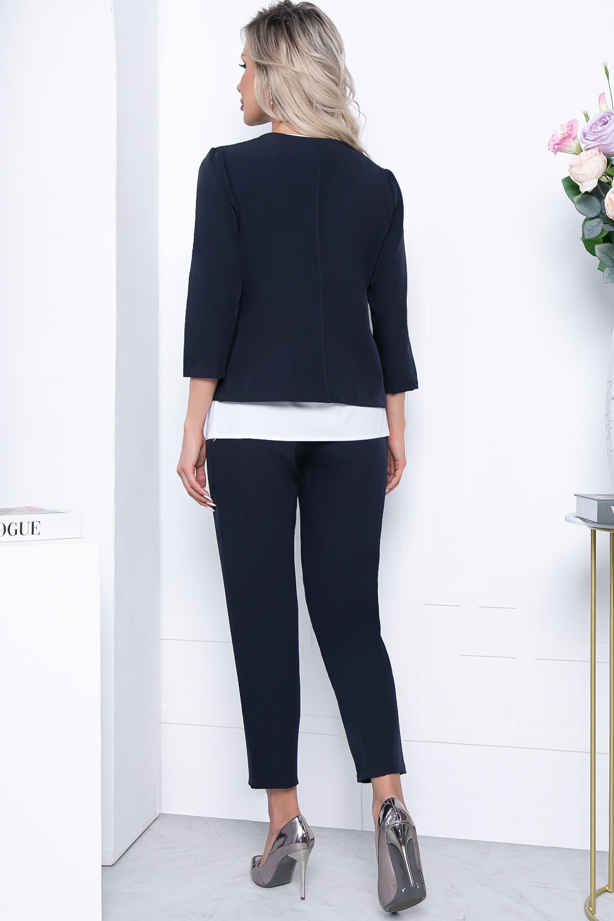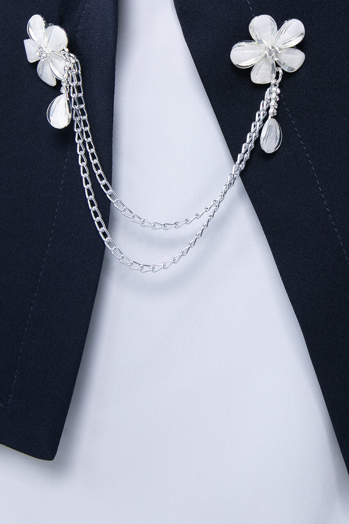 Элегантный классический образ подходит женщинам в любом возрасте и уместен практически в любой ситуации. Костюм из трёх предметов, украшенный брошью - это полностью готовый образ, который выгодно представит вас даже на светском мероприятии, а роскошный синий цвет подчеркнёт утончённый вкус его обладательницы. Топ с округлым вырезом, плечи закрыты, по бокам небольшие разрезы. Жакет прилегающего силуэта, перед жакета с разрезами, декорирован брошью с золотой цепочкой. Классические брюки прямого кроя, талия на резинке, комфортны в носке, универсальная длина.