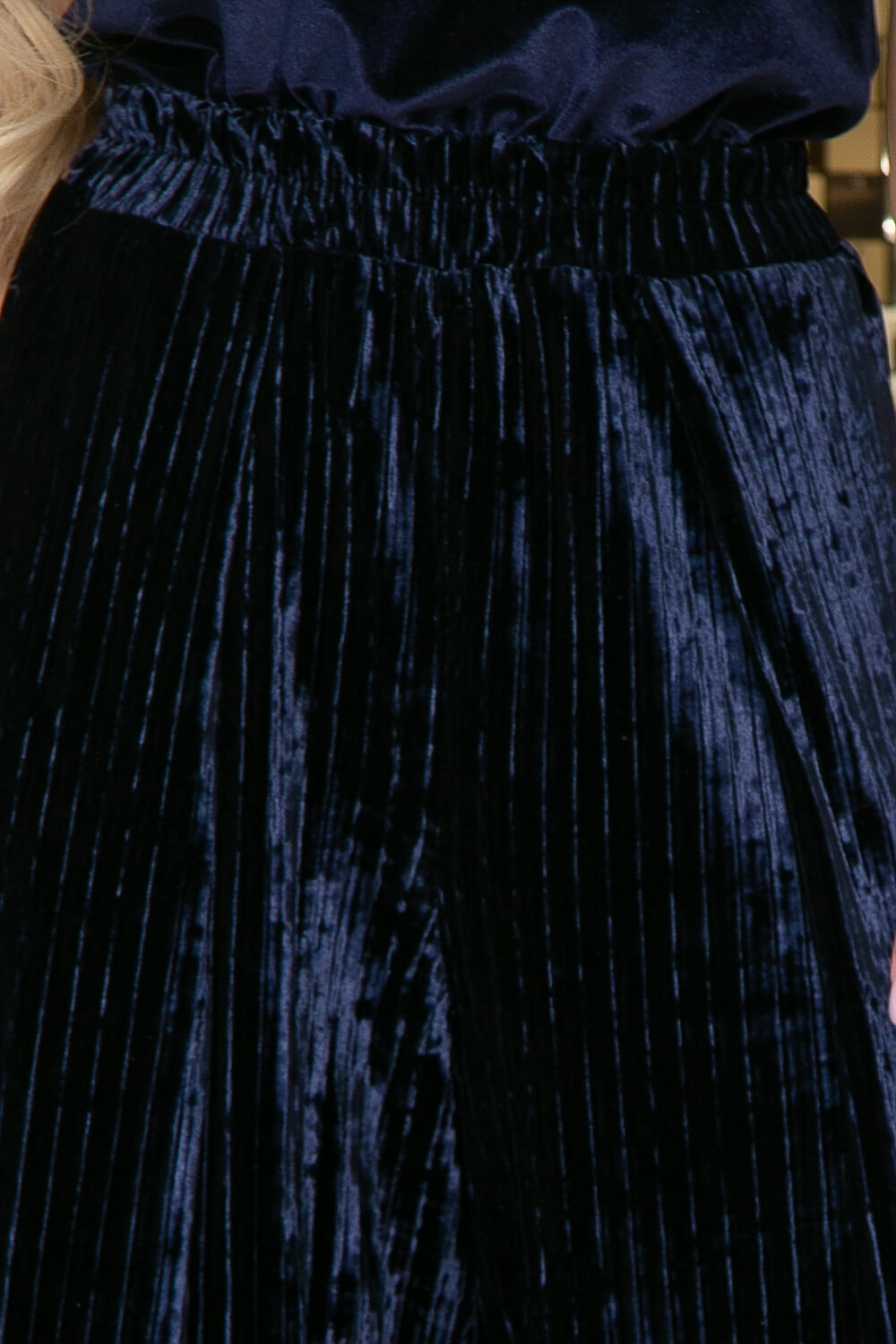 Роскошный бархатный костюм в тёмно-синем оттенке. Богемный лоск этой новинки просто сводит с ума! Шикарные брючки с высокой посадкой не просто идеально смотрятся на фигуре, но и создают полное ощущение комфорта благодаря своему крою и мягкости материала. Образ в этом костюме уже будет считаться самодостаточным благодаря сочетанию двух видов бархата: гладкого и плиссе.