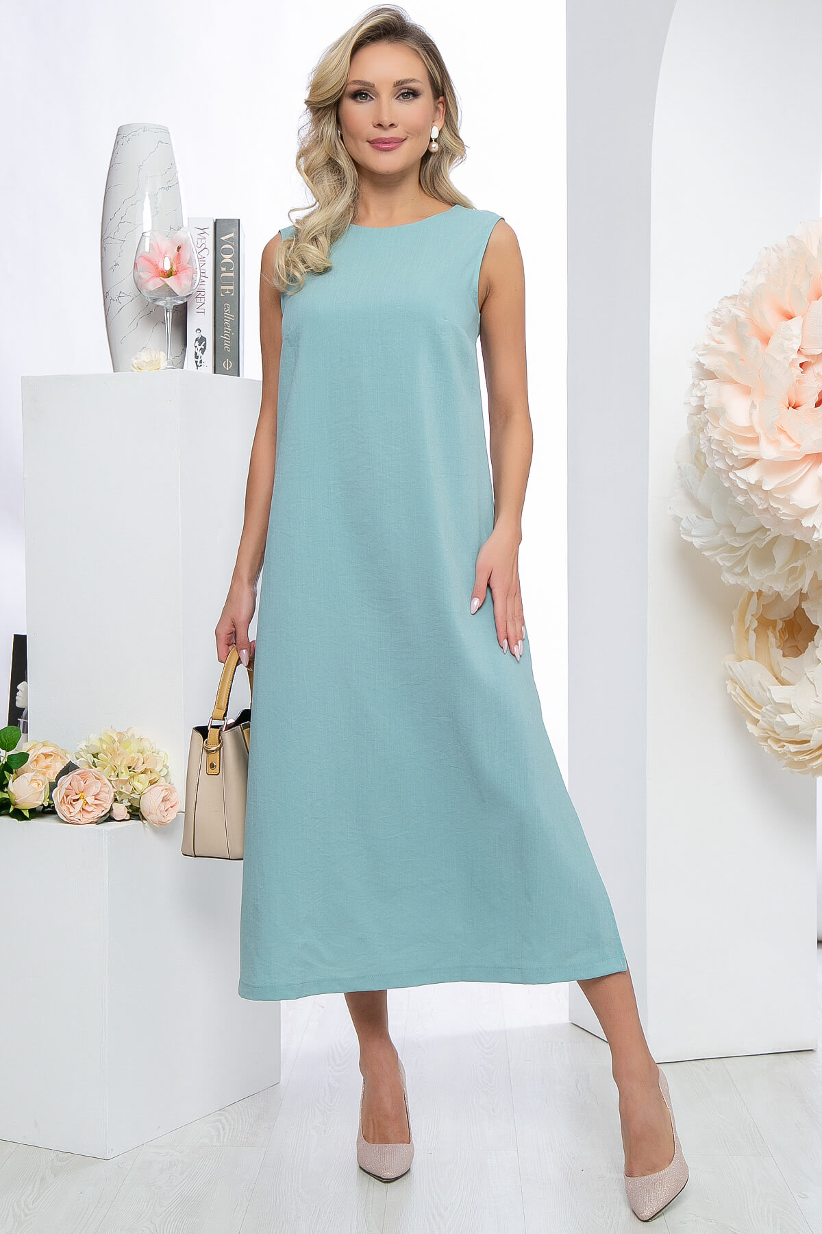 Стильное платье светлого оттенка неприхотливо в уходе и выборе аксессуаров, но при этом является самодостаточным элементом образа. Платье без рукава. Спереди вырез округлый, а сзади V-образный, что добавит вашему образу оригинальных акцентов. По бокам юбки разрезы.
