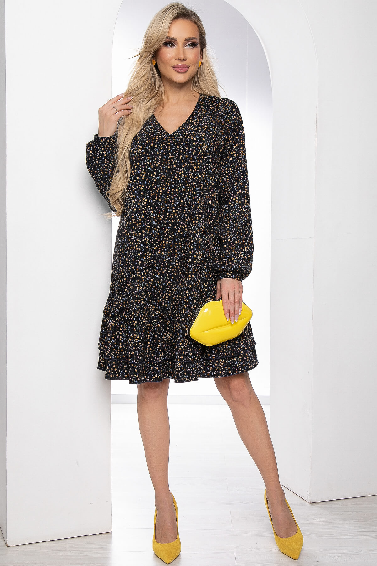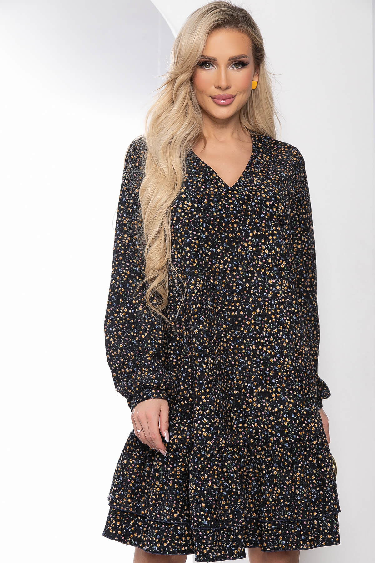 Невероятно женственное платье с цветочным принтом поможет в создании неповторимого игривого образа. Красивый V-образный вырез подчеркивает зону декольте. В таком платье можно провести прекрасный романтический вечер или сходить в кафе с подругами. Выигрышный А-силуэт с воздушными ярусами по низу платья будет отлично смотреться на любом типе фигуре. Длинный втачной рукав на манжете.