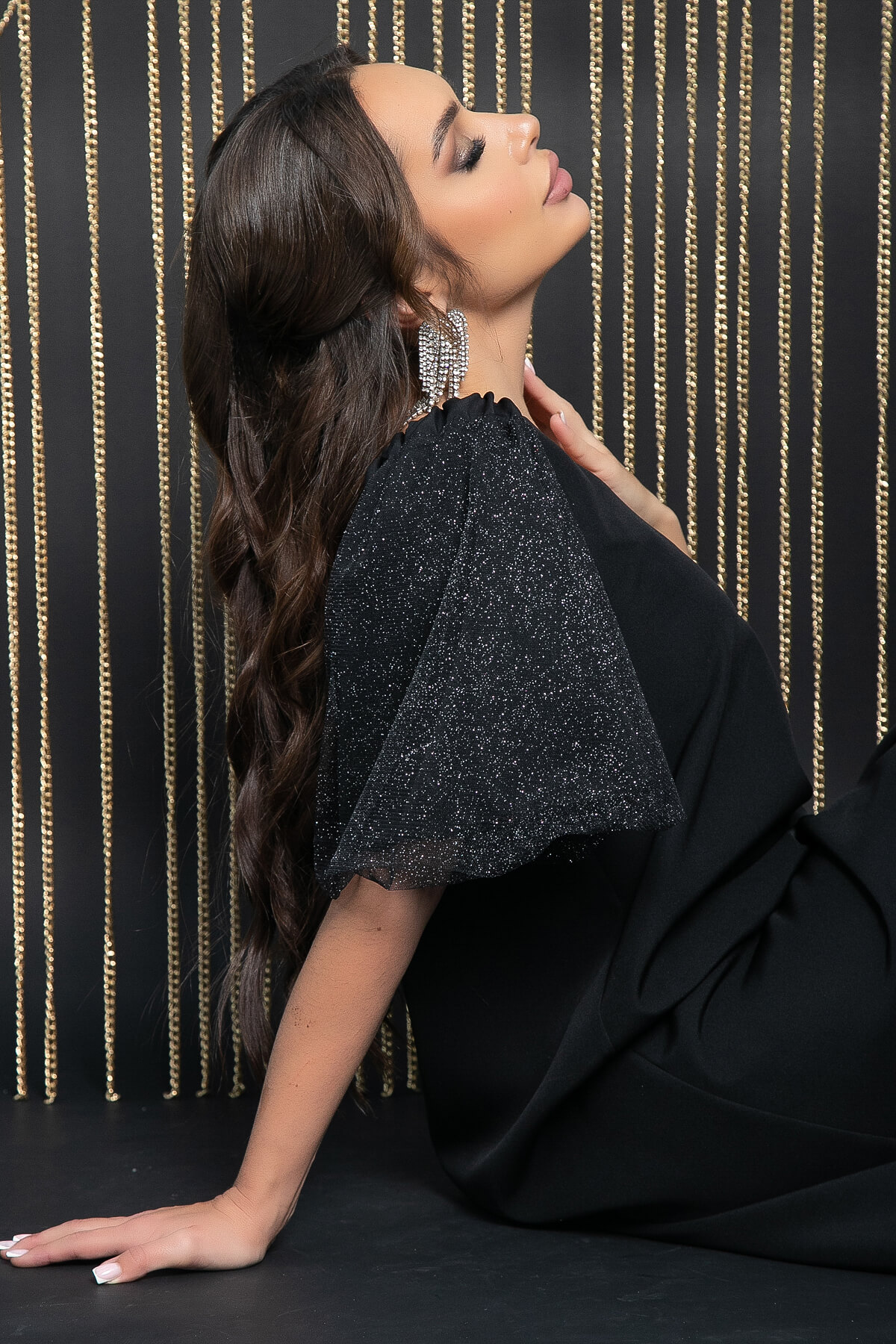 Эта модель идеально сочетает в себе изысканность классики и современные тенденции, создавая поистине великолепный образ. Вырез горловины имеет округлую форму. Рукав короткий с блёстками выполнен на подкладке. В области плеча расположена резинка, которая позволяет его опустить, добавляя образу романтичности и нежности. Такой наряд станет отличным выбором для вечерних мероприятий и торжеств.
