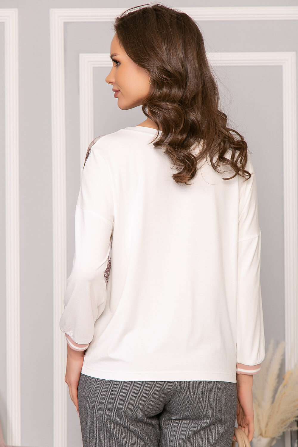 Базовый джемпер выполнен в красивом молочном оттенке. Переднюю часть модели украшает ткань с ненавязчивым принтом. Это базовая вещь, которая одновременно и проста, и изящна, и универсальна. Рукав втачной, на манжете. Линия плеча спущена. Ткань имеет характерный сатиновый отблеск.