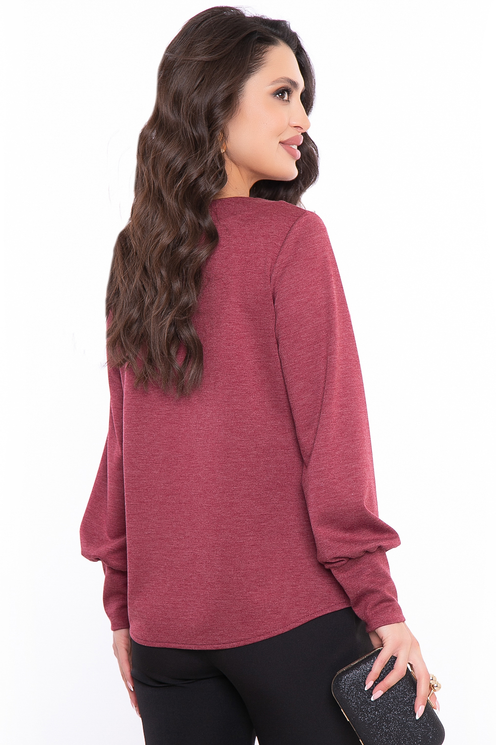 Базовый джемпер в бордовом оттенке с красивым акцентом в виде галочки на вороте.