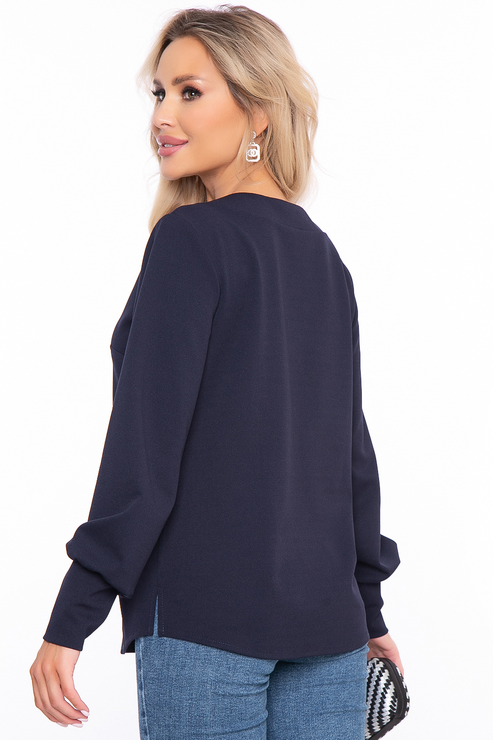 Базовый джемпер в классическом тёмно-синем оттенке с красивым акцентом в виде галочки на вороте.
