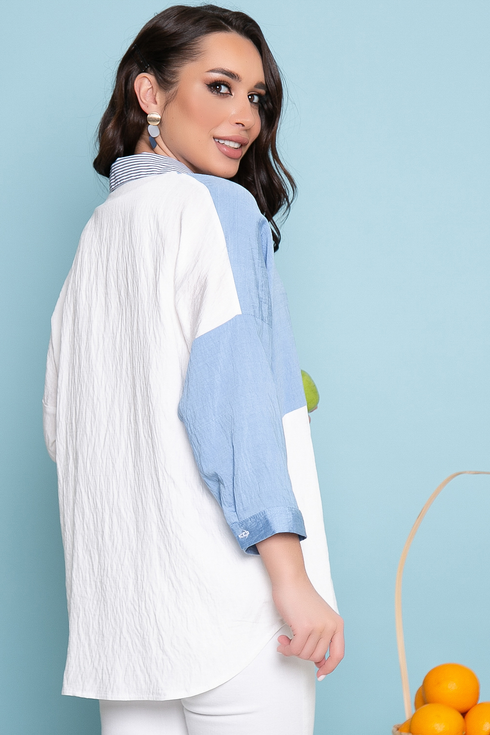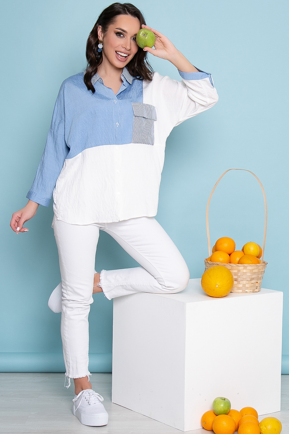 - Цвет: белый, голубой. Принт: полоска (кармашек, воротник);