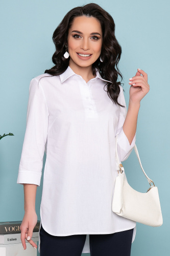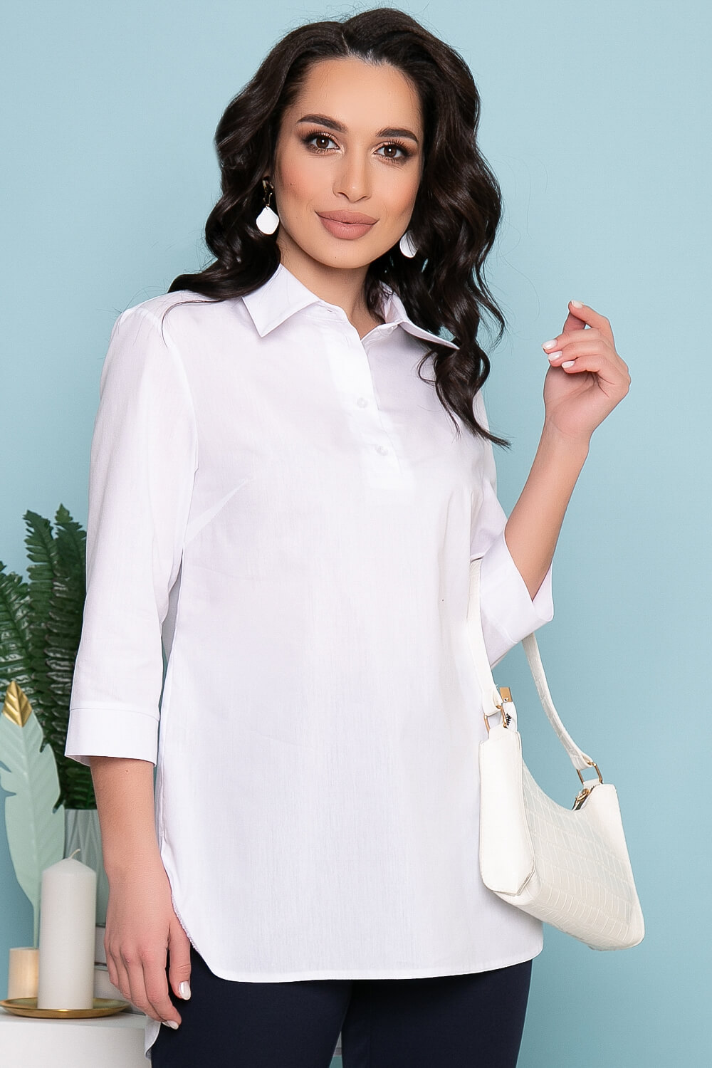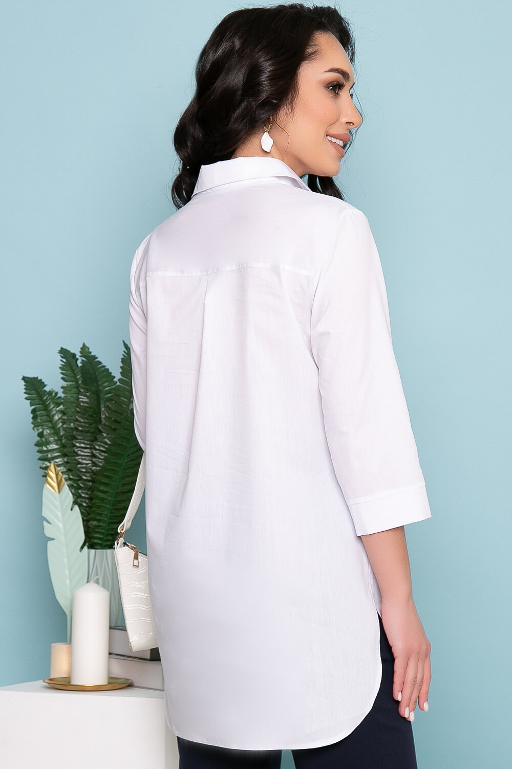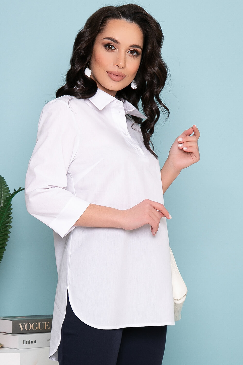 Хлопчатобумажная блуза белого цвета - идеальный вариант на летний период. Блуза с удлиненной спинкой, края скруглены, по бокам разрезы. Классический отложной воротничок, по переду застёгивается на 4 пуговицы. Рукав три четверти, на манжете.