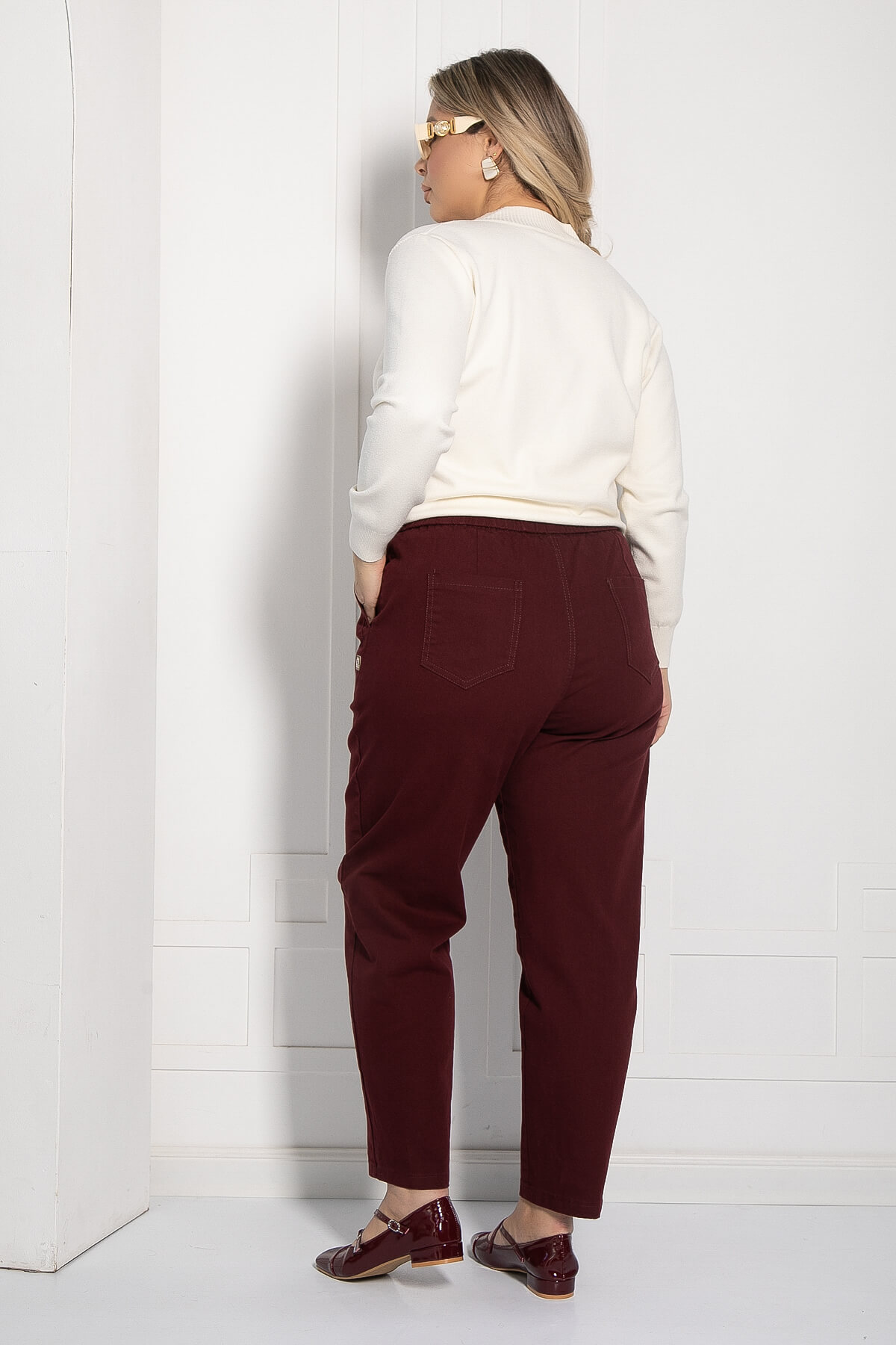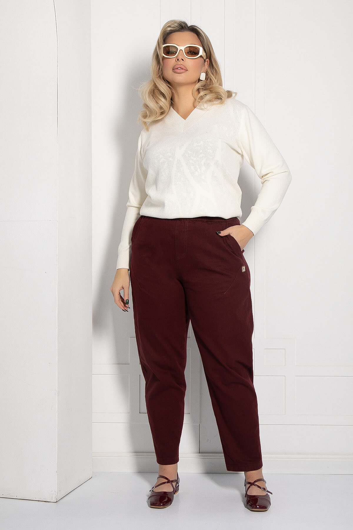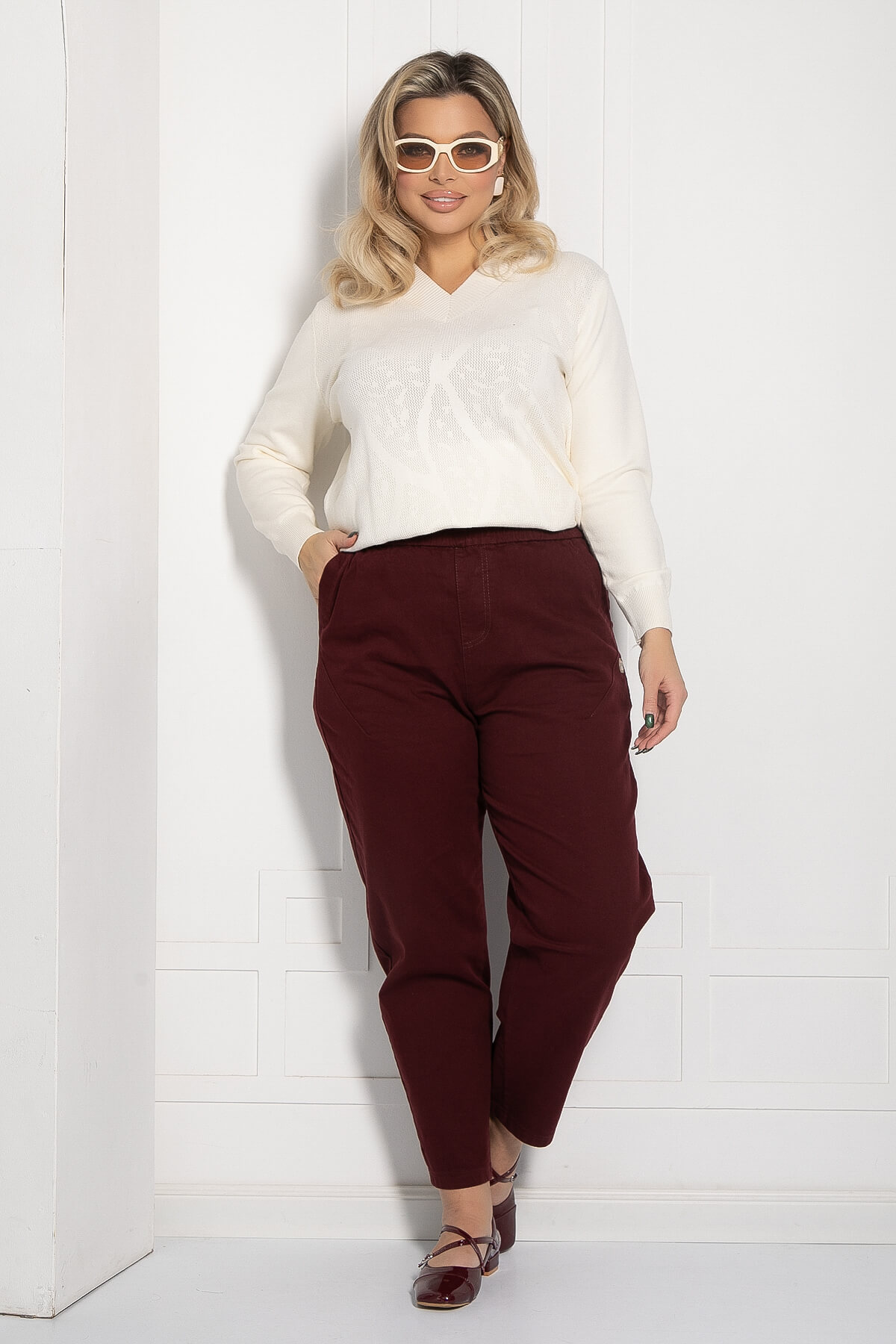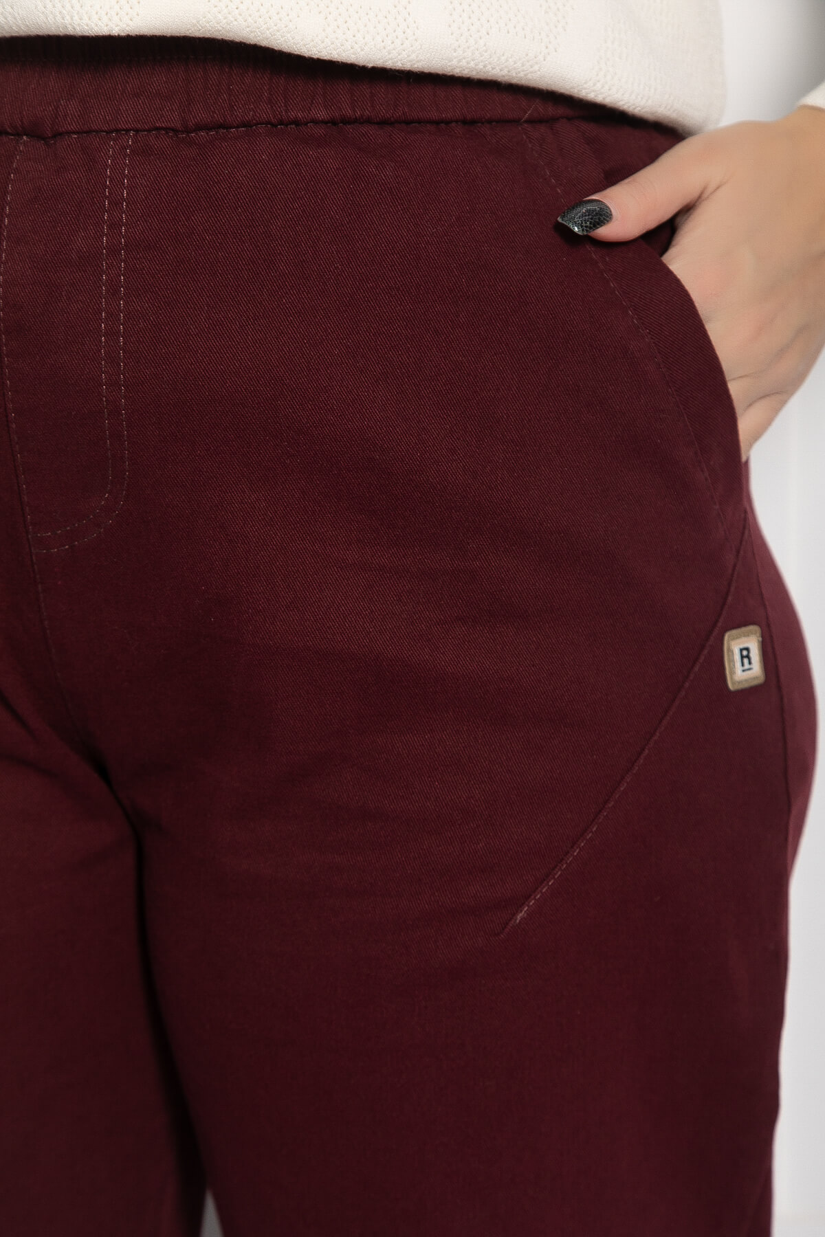 Джинсы в красивом винном цвете — прекрасный вариант для повседневного образа! Благодаря резинке на талии они обеспечивают дополнительный комфорт. А карманы спереди и сзади делают их ещё более практичными. Зауженный к низу крой придаёт образу современный и стильный вид.