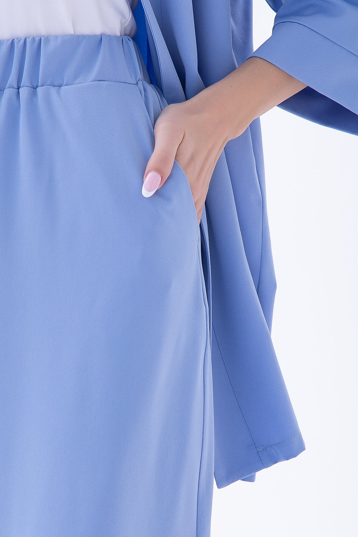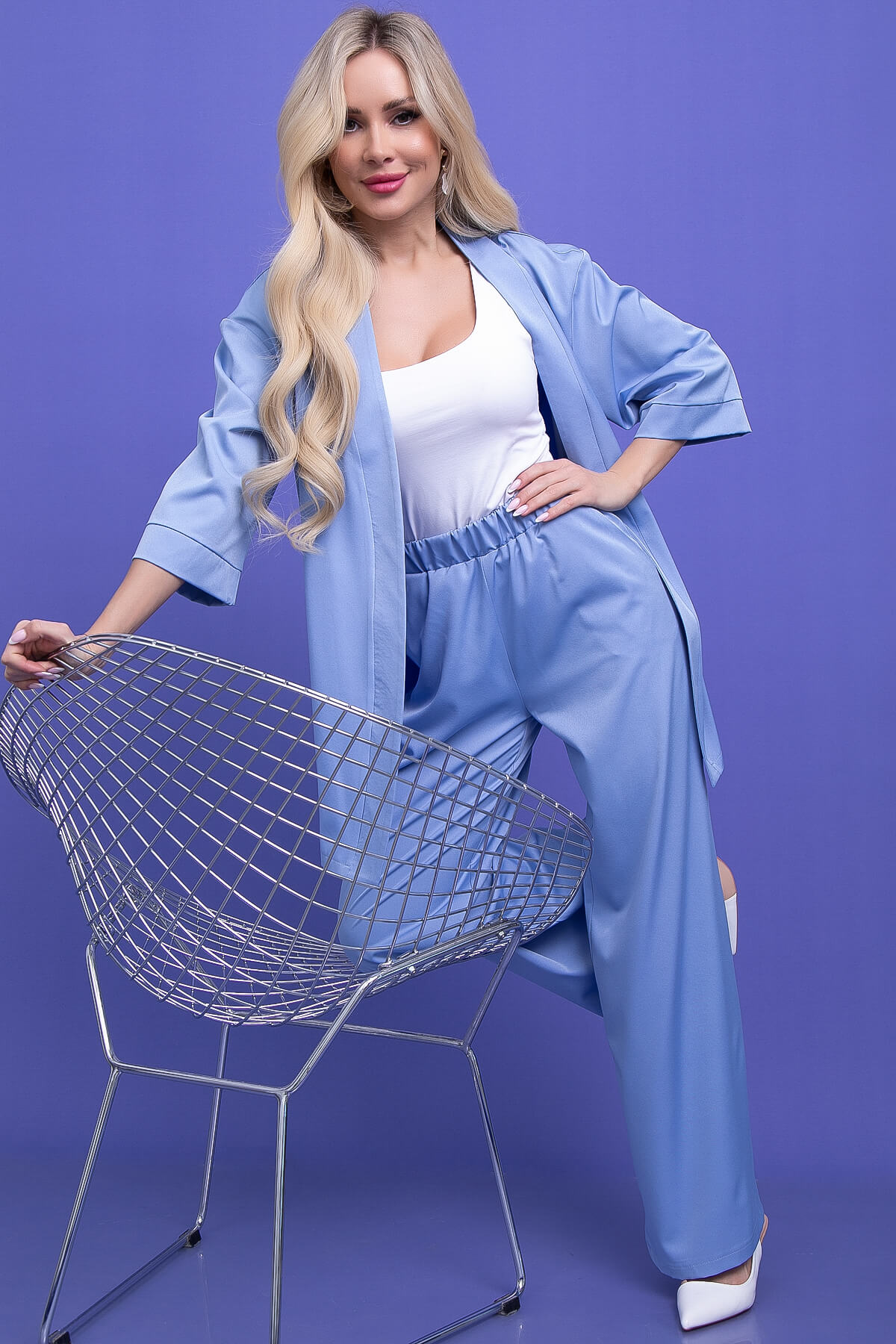 Костюм из лёгкой ткани идеально подойдёт для летнего расслабленного образа. Свободный крой не сковывает движений и дарит комфорт. Рукав укороченный со спущенным плечевым швом.В комплект входит пояс из основной ткани, который позволит подчеркнуть преимущества фигуры.
