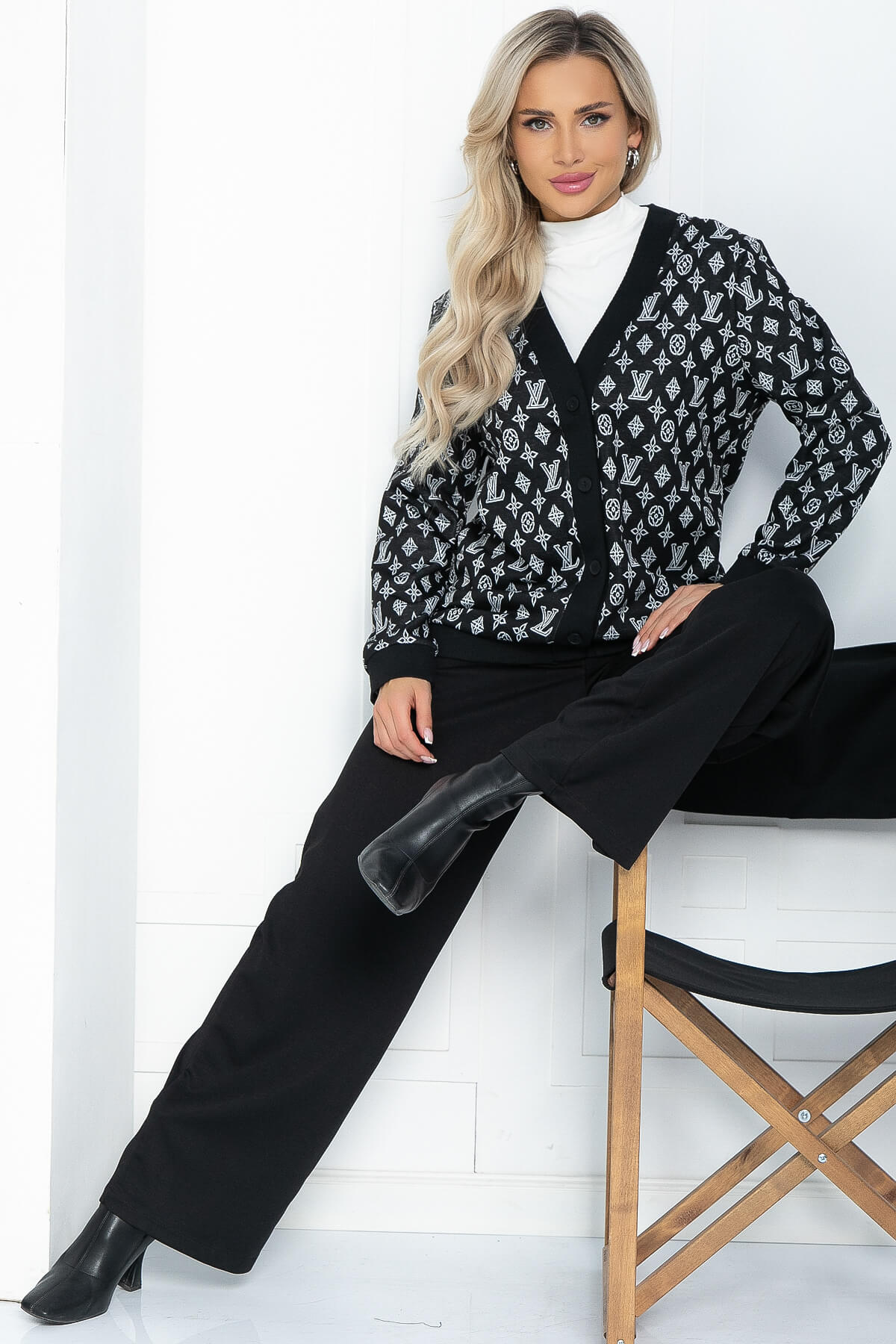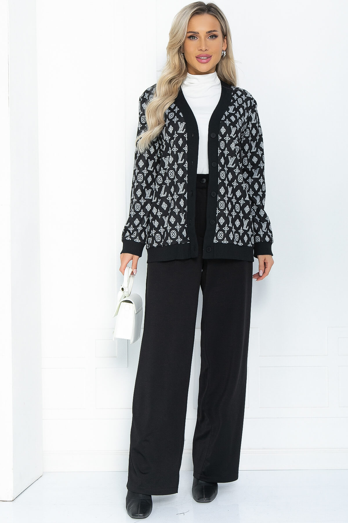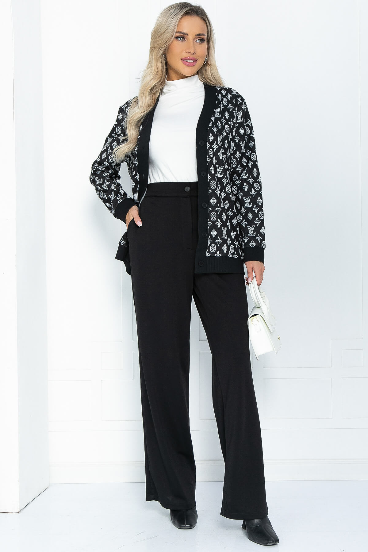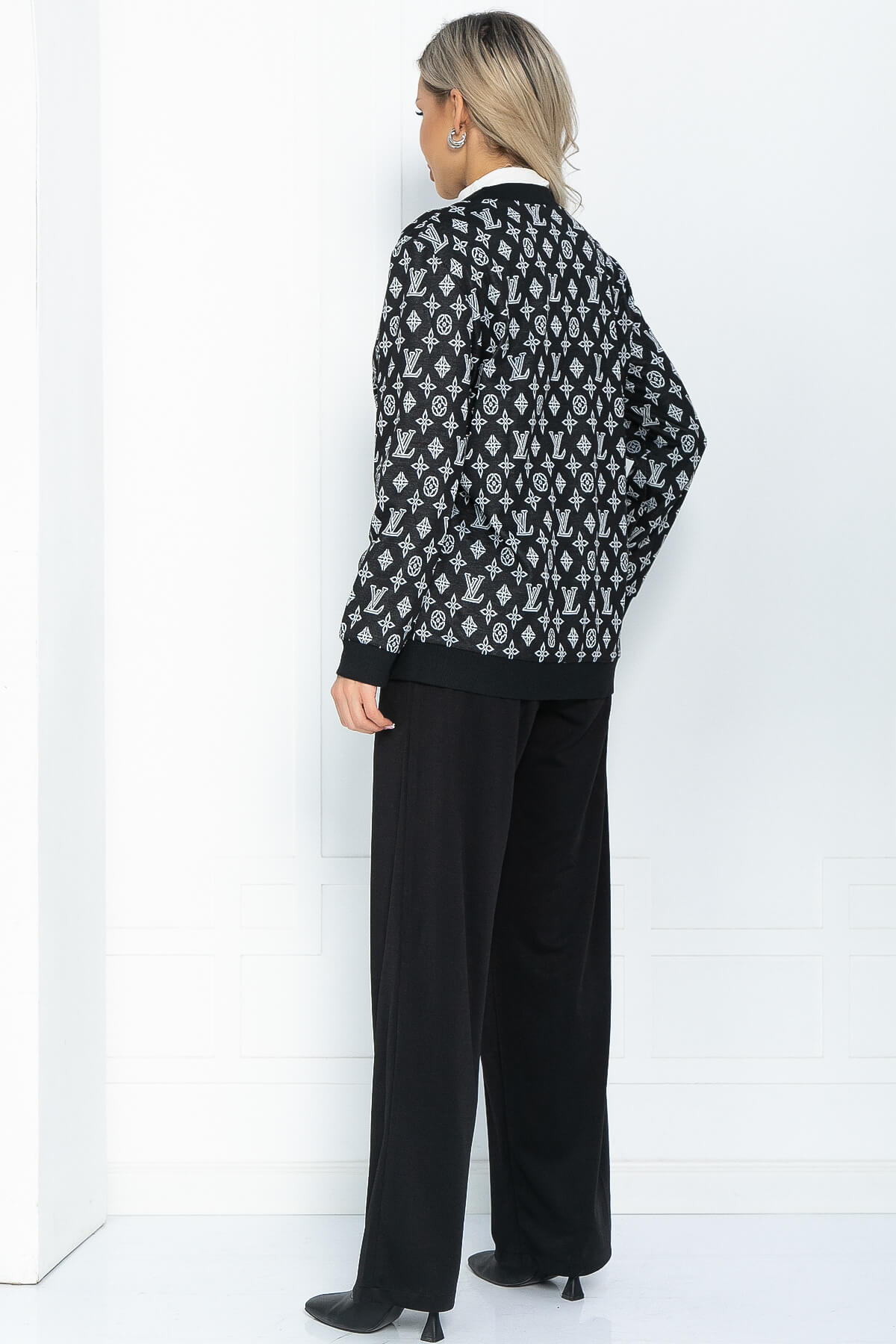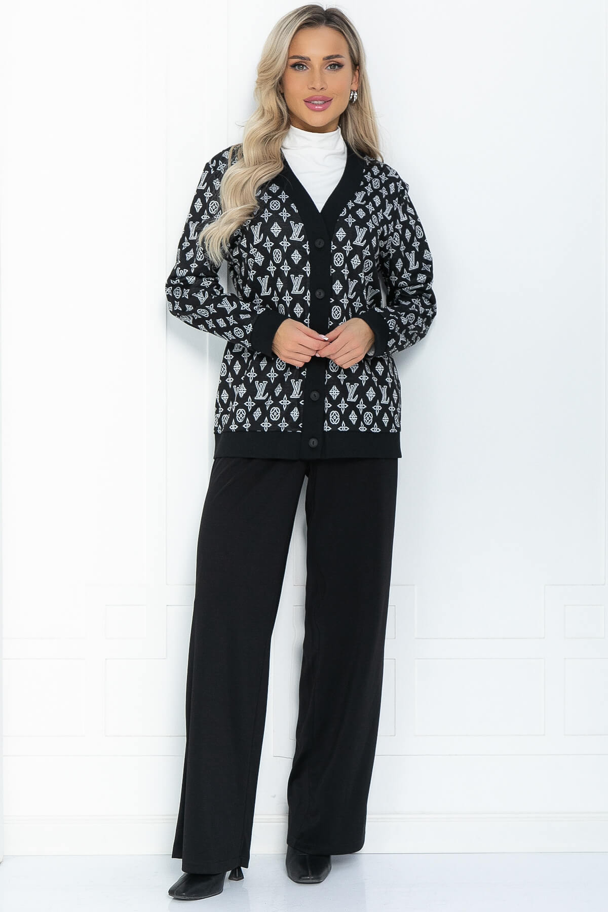 Костюм-двойка, состоящий из классических брюк прямого кроя и свободного жакета с трендовым принтом. Брюки на молнии спереди, сзади талия на резинке, в боковых швах есть карманы. В таком трикотажном костюме можно смело отправиться на прогулку или на встречу с друзьями. Целый день вам будет уютно и комфортно.
