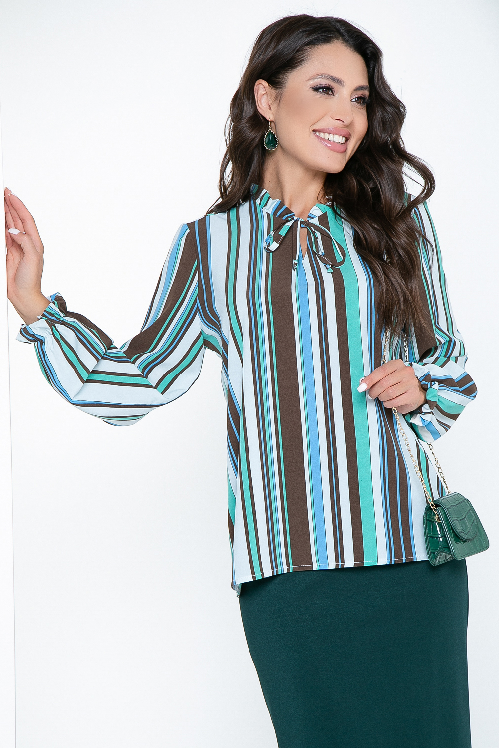 - Блуза прямого кроя, вырез горловины красиво оформлен оборкой и небольшим бантиком;