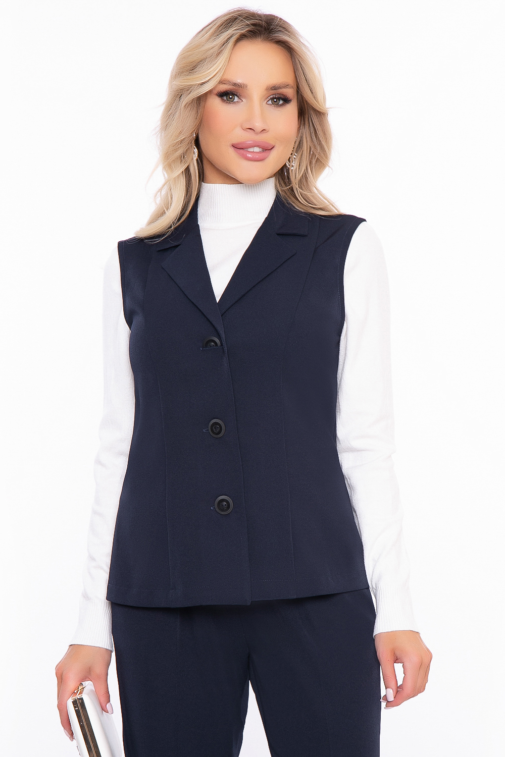 - Жилет полуприлегающего силуэта, застёгивается на пуговицы;