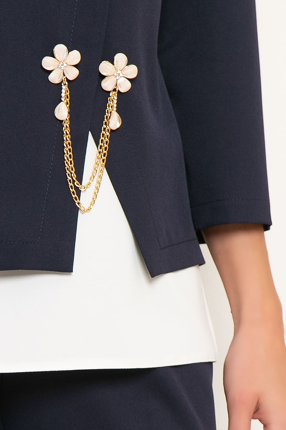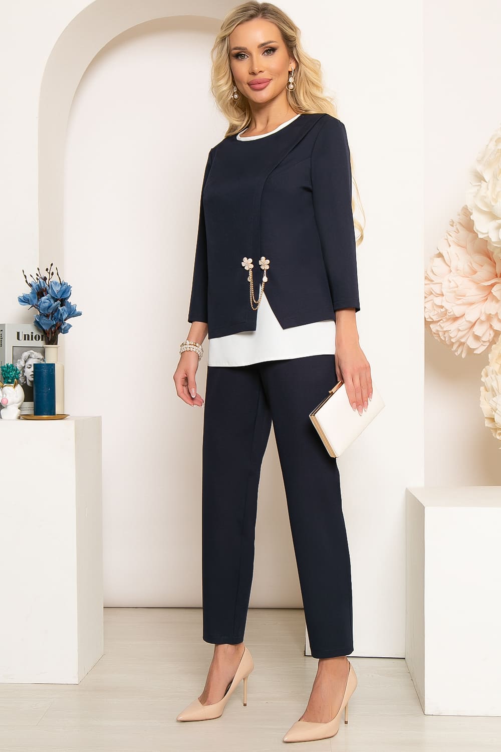 Элегантный классический образ подходит женщинам в любом возрасте и уместен практически в любой ситуации. Костюм из трёх предметов, украшенный брошью - это полностью готовый образ, который выгодно представит Вас даже на светском мероприятии. Топ с округлым вырезом, плечи закрыты, по бокам небольшие разрезы. Жакет прилегающего силуэта, перед жакета с разрезами, декорирован брошью с золотой цепочкой. Классические брюки прямого кроя, талия на резинке, комфортны в носке, универсальная длина.