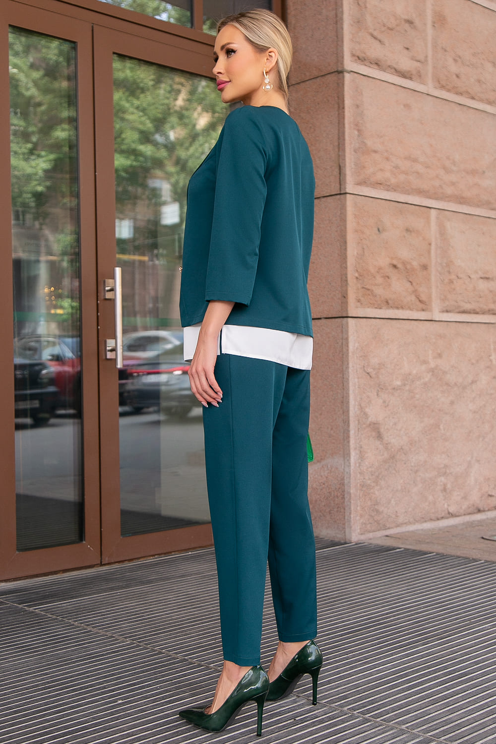 Элегантный классический образ подходит женщинам в любом возрасте и уместен практически в любой ситуации. Костюм из трёх предметов, украшенный брошью - это полностью готовый образ, который выгодно представит Вас даже на светском мероприятии, а роскошный изумрудный цвет подчеркнёт утончённый вкус его обладательницы. Топ с округлым вырезом, плечи закрыты, по бокам небольшие разрезы. Жакет прилегающего силуэта, перед жакета с разрезами, декорирован брошью с золотой цепочкой. Классические брюки прямого кроя, талия на резинке, комфортны в носке, универсальная длина.