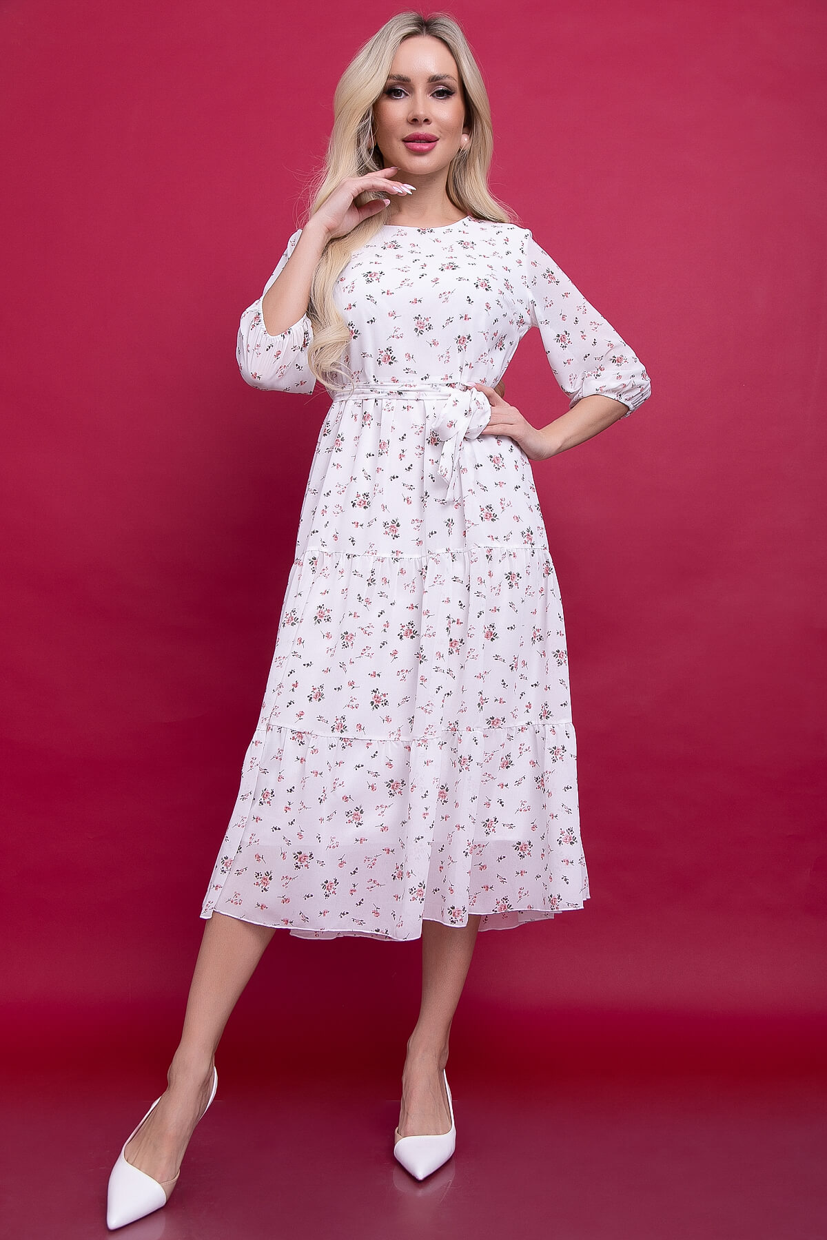 Платье из шифона с цветочным принтом украсит ваш нарядный образ и создаст прекрасное настроение. Белый цвет платья добавит привлекательности. Нежная и струящаяся фактура ткани выгодно подчеркнут достоинства фигуры, а пояс из основной ткани сделает акцент на талии.