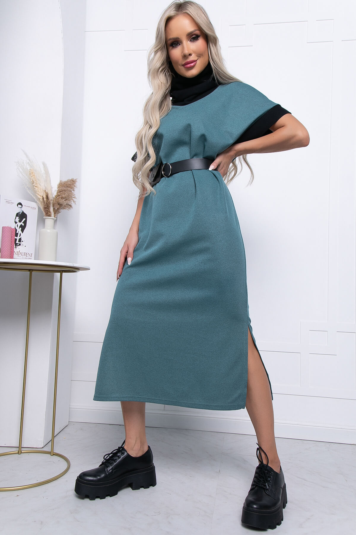 Платье из мягкого трикотажа в сдержанном серо-голубом оттенке прекрасно подойдёт для модных и при этом комфортных повседневных образов. Благодаря простой форме такое платье прекрасно сочетается со многими вещами из женского гардероба. В прохладную пору можно надеть облегающий джемпер в качестве нижнего слоя. Мягкий и объёмный ворот создаст дополнительный комфорт. В комплект входит пояс чёрного из экокожи.