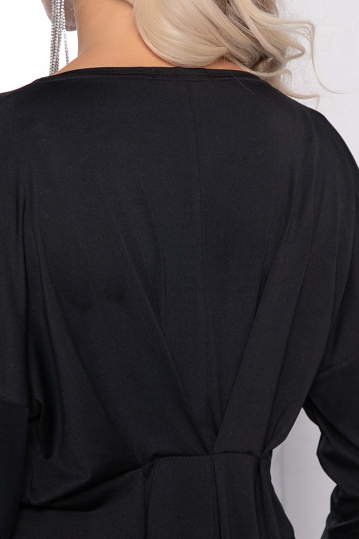 Платье из тонкого, струящегося трикотажа в классическом ультра чёрном цвете. Сложно поспорить с тем, что подобная вещь способна стать незаменимой в гардеробе. Платье имеет непринуждённый свободный крой, при этом позволяет выглядеть максимально эффектно. Линия талии завышена и на ней выполнены встречные складки. Рукав у платья цельнокроенный, три четверти.