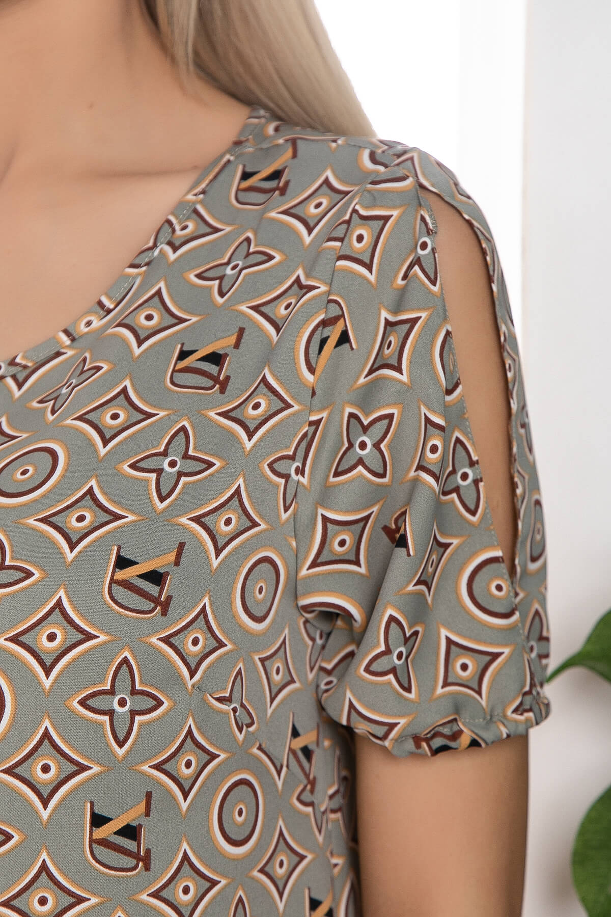 Легкое и свободное платье оливкового оттенка. Можно носить как в повседневной жизни, так и на работу или на прогулку с друзьями. Рукав укороченный, втачной с разрезом по плечу и по низу на резинке.