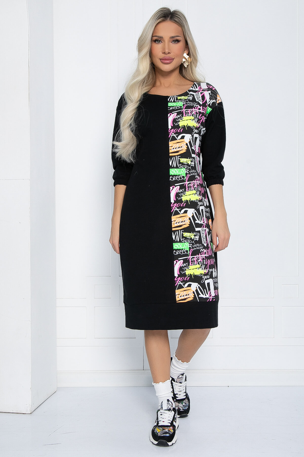 Повседневное платье в стиле спорт-шик — это превосходный выбор для стильных и активных женщин. Особенностью этой модели является необычное дизайнерское решение: перед платья делится на две части. Одна часть выполнена из основного трикотажного материала, а другая — из ткани с эффектным принтом, что создаёт уникальный акцент и выделяет ваше платье среди прочих. Оно станет отличным выбором для повседневных выходов, прогулок по городу или встреч с друзьями. Горловина платья округлая, рукав со спущенным плечом, по низу рукава — резинка. Низ платья оформлен широкой манжетой.