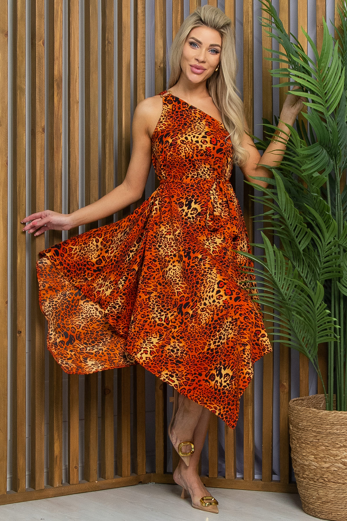 Великолепная модель платья свободного летящего силуэта, выполненная из легкой шелковистой ткани с необычным нарядным принтом. На одном плече ткань красиво задрапирована и зафиксирована неразъемным кольцом. Низ платья имеет разную длину, которая придает модели особый шарм и сделает ваш образ очень эффектным. Платье абсолютно свободное, с красивой мягкой драпировкой, которая достигается за счет длинного пояса. В таком платье вы будете чувствовать себя единственной и очень романтичной.